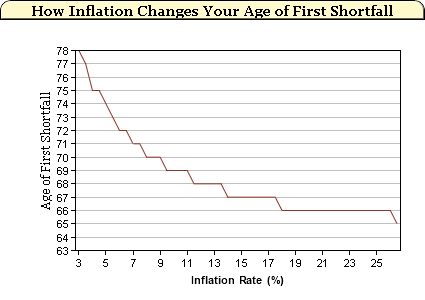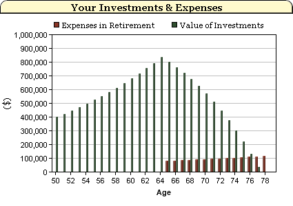 After taking into account investment gains, taxes, and inflation, you are estimated to run out of money by age 78. If inflation is 1% point higher, you are estimated to run out of money by age 75. If inflation is 2% points higher, you are estimated to run out of money by age 74.